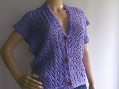 This simple summer top is constructed working the two front panels first, then joining them to work the back. No seams and no buttonholes. (the eyelets in the pattern are used as buttonholes)