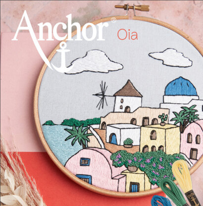 The motif of our modern embroidery project is a small village called Oia on the Santorini island. Houses are painted in white, pink and yellow with blue roofs, lots of greenery, mill houses and a sunny summer atmosphere.
