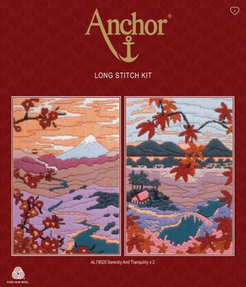 Lovely Serenity Tquility Pk2 Long Stitch kit by Anchor includes everything you need to create the design. Kit includes: printed, 22 count, open weave, cotton canvas; Anchor Tapesserie Wool; needle; chartered design; front sheet picture and instructions.