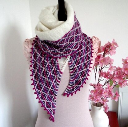 Andean Feeling shawl is a half circle shawl worked in one piece from top down. Mosaic knitting is used for bottom section of shawl, this technique is very interesting and is fully written out row-by-row and illustrated in chart form.