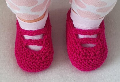 These 8ply garter st baby shoes or slippers have two i-cord bars over the foot. This design is also available in 3ply and 4ply.