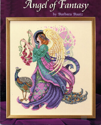 Designed by: Barbara Baatz Hillman. This ethereal angel brings creativity and inspiration! Dressed in jewel tones, this angel is carrying rubies and orchids next to a elegant peacock. Beautiful displayed on a wall or mantel. It’s a striking design will bring color and imagination into your home.\n