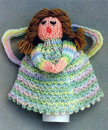 Use this as a tree topper, or table decoration for the Holidays. A good, but funny way to use up a toilet roll tube! This will be the base of the angel to stand her up or place on top of a tree! A pretty dress , made with easy textured stitches, is worked up quickly! The work on up to head and complete with arms and hair. We like the braided hair, but you can invent a hair style if you wish! Uses sport weight yarns, and knitting needles, US # 6. Finished size is about 7 ½ tall.