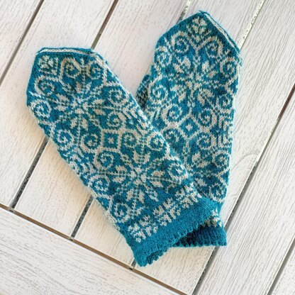 The pattern is made up of charts and written instructions in one size (ca 10 cm across the back of the hand), but you can easily change the size by using different needles and/or yarn.