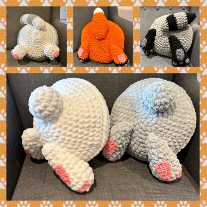 Create your own adorable animal bum pillows with this detailed crochet pattern. Includes instructions for a bunny, cat, raccoon, and fox bum pillows.