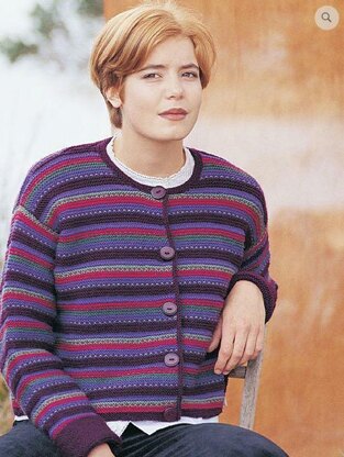 This Vintage pattern uses Classic DK Wool and gives instructions for a long or cropped jacket with drop shoulder shaping and fold back sleeve cuffs. The jacket is worked in stripes of Garter stitch with a variety of colours.