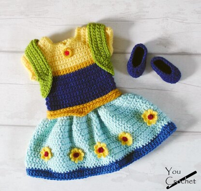 Directions for the waistcoat, shoes and dress are included in 3 different sizes.