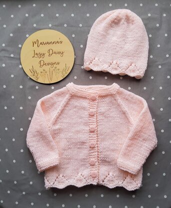 A cute little cardigan jacket and matching hat - both with a pretty edging