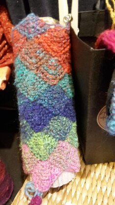 The handwarmers are knitted in Cascading Squares pattern.