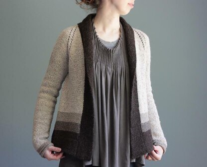 Anora is an a-line shaped, open-style cardigan with seamless top-down raglan construction and features a gradient striping pattern at the bottom. A total of 4 colors will be needed (in worsted-weight): your main color and then 3 additional for the stripes and front bands. This is a great beginner sweater pattern that combines lots of basic sweater techniques: knitting from the top-down, adding stripes, picking up stitches and working short rows (to shape the shawl collar). It's an open-style cardigan meaning the front bands are not designed to overlap in the front (but can be stretched a bit and secured with a shawl pin or clasp if you like).