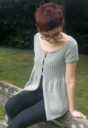 Antoinette is a cropped, seamless little cardigan mostly worked flat from the top down, with a very loose gauge. The design features peplum shaping, short raglan sleeves and an easy and fun twisted cable motif (without cable needle) for the yoke. The edges are worked simultaneously in broken rib and button and button hole bands are picked up and bound off with i-cords.
