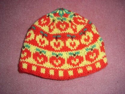 Heard one mom say: "Apple of my eye" to her little baby. So this hat came into existence. When I was small I had a cot beedsheet in similar colors, too. That I used the ladder-like part of my cot as a ladder, climbed the wardrobe, put all things out, and was finally wearing 5 shirts but no trousers is another story.. ;-) And hey, it's autumn, apple harvest time, too! ;-) It has a two color ribbing, followed by bands of red and yellow apples and has a cute little crown at the top.