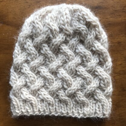 This winter hat features a lattice of 2/2 cables. The pattern is for a single size (24” circumference, 9” length), but the instructions provided make it easy to modify the size or gauge. The yarn used for this pattern is We Are Knitters The Petite Wool, but any yarn of any weight should work.