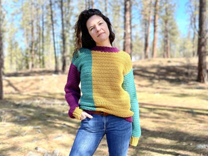 Pick your three favorite colors of some deliciously soft bulky weight yarn and a crochet hook and get going on this color block sweater today. You won't regret it!