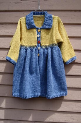 April-April was created for a little girl to wear as a jacket, coat, or dress, either will impress. The yarn from Lion Brand’s LB Collection Cotton Bamboo will feel soft and look luxurious. The finished garment is very practical by itself or layered. This is a perfect project for a knitter with some experience in knitting sweaters. If you know how to knit and purl, and pick-up and cast-off stitches, you will succeed re-creating April-April for your special little girl. The length of the skirt is dependent on your preference. You can decide if you want the skirt to end above the knee, halfway down the knee, or below the knee. You can also choose between the yellow/blue, or the pink/blue dress color combination. The pictures with the yellow top are from a size (2) April-April Jacket Dress and the model is 2 years old. The pink variant is a size (1). Skirt: 3 skeins 100g/3.5 oz in blue, color# 107, Hyacinth. Body contrast color (cc): 2 skeins 100g/3.5 oz in yellow, color# 170, Gard