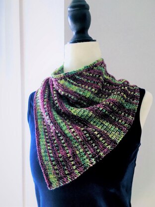 The April Showers cowl is worked flat in a triangular shape, then the ends of the triangle are joined to make a cowl. The triangle is knit on the bias, in the same way as an asymmetrical triangular shawl, starting with a few cast on stitches.