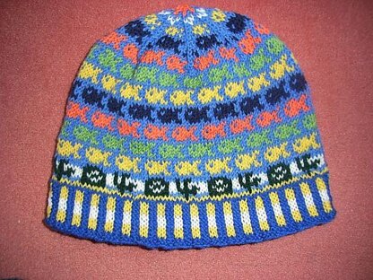 Summertime! Holidays! The ocean, happy colorful fishes and a hidden treasure box are on this cute little beanie. It has a multicolor ribbing, followed by a band of water plants and treasure boxes. Then follow the colorful fish bands. At the top is a lovely little sea star, making the top appear like a flower of sea star and little fish.