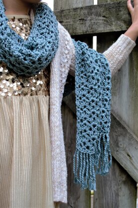 The Arabella Scarf features a lacey crochet stitch and a twisted fringe edge. It’s a wonderful layering piece for all seasons.