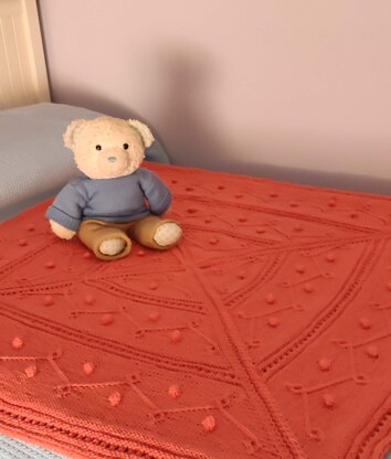 Arabesco is a square baby blanket started in the center. It is knitted with circular needles using the magic loop technique or double-point needles. It is divided into four parts by three-stitch cables and decorated with reliefs made with twisted stitches and bobbles. Although it may seem somewhat complicated, it is not at all and is really lovely.