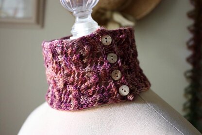The Arabesque lace neck cuff knitting pattern: rustic and elegant lace with cabled, gracefully waving lines, attached icord borders and a hand stitched button placket. Not only fun to knit, this is also a fairly quick lace project for advanced beginner knitters on up. This pattern includes three sizes (S, M, L) and a lace chart in addition to written instructions.