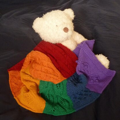 Strikingly different heirloom baby pram blanket, blending a muted rainbow of stripes with different textures and aran-style stitches. It's knit in one piece using 6 colours at once, with a simple crochet border. The variety of textures means that it would look just as beautiful in one colour.