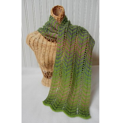 The lace chevron pattern on this scarf reminds me of the feather fletching on arrows. Lightweight and lacy. A fun way to showcase a long color-change yarn.