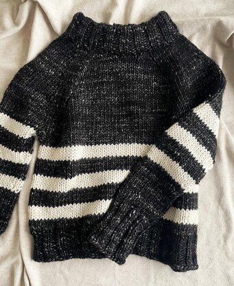 Sweater features a slight oversize fit and deep raglan design. It is knitted top down with German short rows that raise then neck and shoulders for a perfect fit. Stripes and wide raglan bands add interest to a classic sweater.