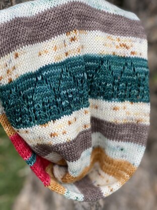This yarn set was meant to be used together and I thought a lovely cowl was just the thing. I wanted simple stripes to show off all of the beautiful colors, plus an added section of lace with little houses in it. This year of 2020 has had a lot of us at home, and I wanted to showcase the times with this row of houses. No matter what we can always take a walk around the block.