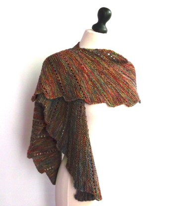 This garter stitch scarf is constructed using short row wedges, each separated by a row of eyelets. The sloped bind off method is used to create the sweeping curve which sits beautifully around the shoulders.