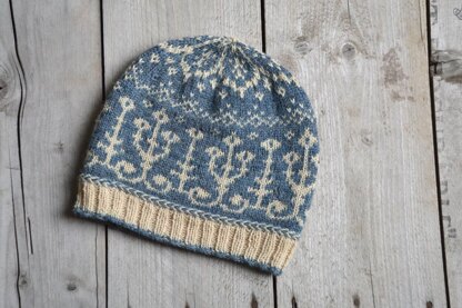 Artis is a stranded colourwork toque, inspired by snow-covered wrought iron fencing, reflecting moonlight under a starry winter sky.