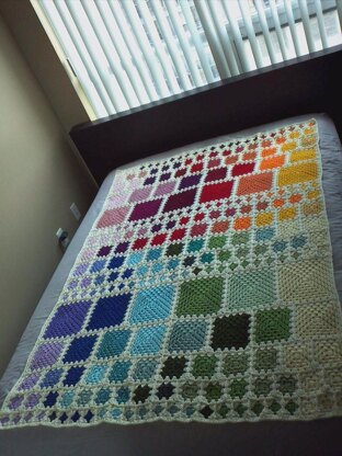 There are both a RH- and LH-crochet join schematics. Finished size is approximately 21.3 x 16 times (11.3 x 8 times) bigger than your 3-round square. Sample measures 64” x 48” (34” x 24”)