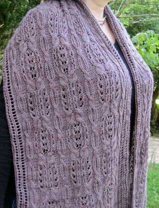 This is a pattern for a knit shawl that features three lace and cable stitches that come to us from Japan. The focal stitch is an intricate and unique cable lace stitch that makes quite a statement. It is surrounded by very interesting cables. The side “Japanese” ladder stitches frame the other two stitches beautifully. There are also instructions contained within the pattern for an optional crocheted edging.