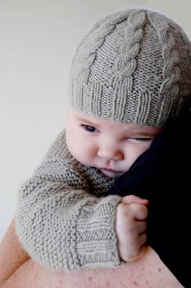 A crew neck, garter stitch sweater with a cable beanie. An 8ply textured pattern featuring a button shoulder opening. The Beanie pattern has two versions, knitted flat on straight needles or on the round on double pointed needles.