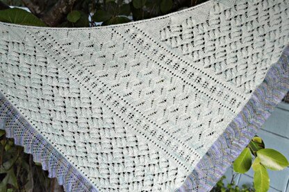 This shawl is my interpretation of an Asian landscape, worked in lace stitch patterns that are meant to evoke hilly terrain, flowing water with the hint of a bridge, tree branches, and abundant foliage.