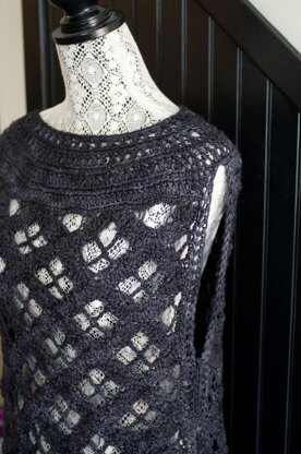 This noble crocheted sleeveless tunic falls to mid-thigh, and is left open below the armhole on the sides. It is a piece that pairs well with a tank top and jeans or leggings, or with something colorful beneath to highlight the geometric lace pattern of the fabric.