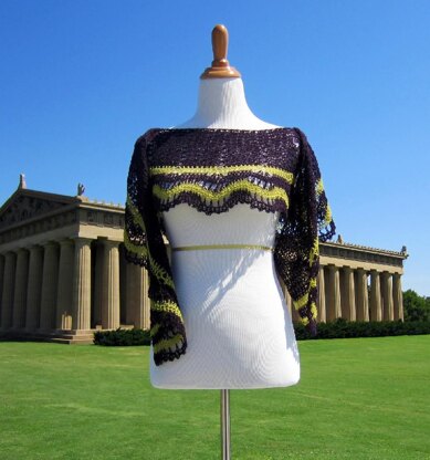 Athena's Wrap is a lacy accessory. It is worked sideways to create the length and a good portion of the width of the wrap. The laciest rows are then worked back and forth along the bottom edge of the fabric. After blocking, it is 76 in.(193cm) along the inner curve, and 9.5 in.(24.1cm)wide.