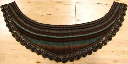 Fabulous yarn in an easy and attractive shawlette. This gets its interesting colorwork through the use of short rows. The edging is lace and is a very easy 11 stitch repeat.