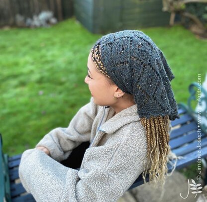 A delightful arrangement of diamond lace and beads makes this a practical headscarf. It is knitted from the top down with beads that are applied with a bead hook (Optional: Pre-thread your beads, if preferred).