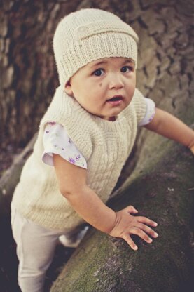 A textured vest pattern with a garter yoke, and a matching hat with a buttoned tab. A simple cable front panel adds interest to this buttoned vest.