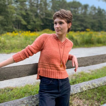 Audrey’s Pullover is a seamless, top-down raglan sweater featuring a v-shaped neckline, high/low split hem and optional subtle striping. It also includes instructions for either no body shaping or an A-line silhouette.