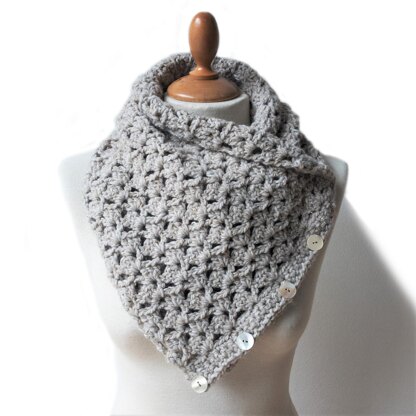 The stitches in this pattern are beginner friendly. You will use double crochet and chain stitches throughout to create a beautiful shell textured cowl with a button closure. This pattern includes two styling options; option A is square shaped and option B is bandana shaped.