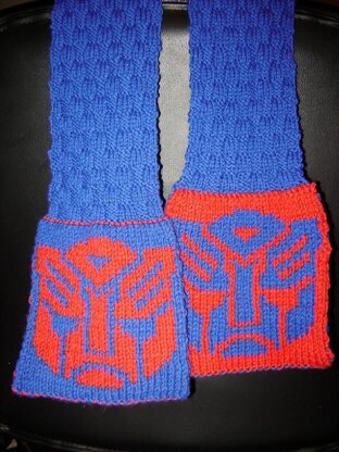 Scarf is knit from the bottom of each logo up and grafted together in the center. Length is easily adjusted by doing more or fewer repeats.