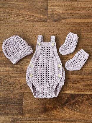 A pretty 3 piece set with a simple eyelet stitch. The romper is knitted from the back through to the gusset and then onto the front. It does not need sewing up and just fastens with buttons at the sides and on the straps, making it easy to put on and off for nappy changing.