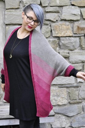 The unusual top-down construction of this casual cardigan starts at the shoulder seam makes for an interesting and fun knit, the relaxing garter stitch is broken up by decorative brioche elements. The cardigan is knit in 4 colors that fade into each other.