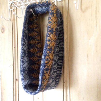 Autumnal Fair Isle patterned cowl knitted in the round. Starts off with a ribbed edging that flows into a 10 stitch repeat pine tree forest. 2 rows of feminine flowers circle the scarf before another set of pine trees and the outer ribbed edge. The cowl is wide enough to take over your head, scrunch up tight or fold in half.