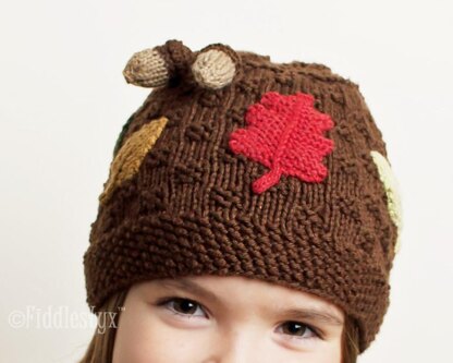 Knit in the round in a simple textured stitch, the bright autumn leaves are knit separately and sewn on later. A pair of acorns dangle from the top.