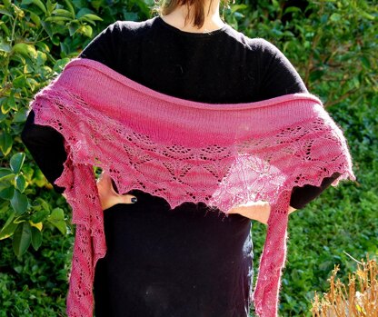 This is a pattern for a crescent-ish shape shawl with 3 size choices and a bonus shawl (seen in pink). This is a bottom up shawl, knit on both sides.