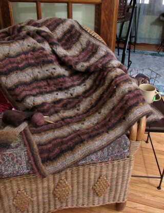 Lightweight and warm, this is the perfect piece to grab whether you plan on hibernating for just a day or need to stay warm and toasty all winter long. Worked on large needles, this throw will work up quickly, and the self-striping character of Aero will keep you interested. The center portion is worked in a variation of the Honey Bee stitch, with panels of a complementary pattern on each side of the center panel. Work begins with a wide band of garter, and ends the same way. A narrower band of garter is added to each side of the throw.