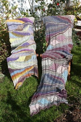 Ich habe den Schal in 2 Varianten gestrickt. Mit dem Noro-Garn mit Farbverlauf gestrickt, wirkt er malerischer, die 2. Variante besteht aus mehreren Garnen, die sich stärker von einander abheben. Hier sind die grafischen Formen klar erkennbar.