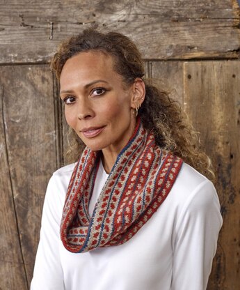 This cowl has no right or wrong side as it is knitted in the round and joined together. Manos Del Uruguay Alpaca Heather A: Beige H704, 1 x 100g skein B: Bark H2371, 2 x 50g skeins C: Honeycomb H2222, 1 x 50g skein
